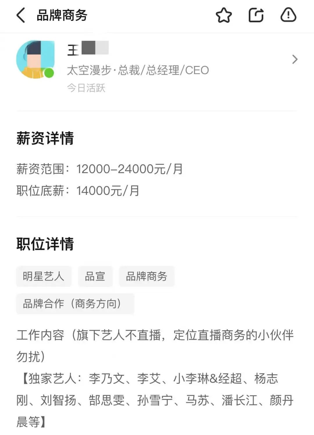 天眼妹看到,BOSS直聘平台上,该公司其中一个岗位的职位详情中写着,旗下的独家艺人除了潘长江,还包括李乃文、杨志刚、马苏等。