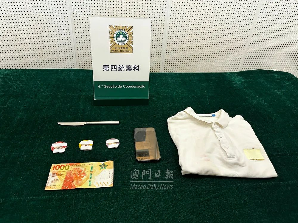 司警经调查,同日上午10时半,在路氹某赌场拘捕涉案刘某,在其身上检获1,000港元现金及6,500港元筹码疑赃款。在案发酒店客房检获餐刀犯案工具。 |