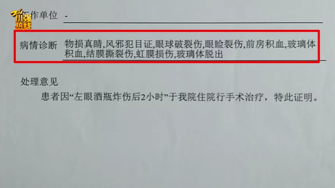 俞大伯今年54岁,已经在床上躺了一个月了。他的左眼现在看不到东西,根据当地医院出具的医学证明,这只眼睛存在眼球破裂伤、玻璃体脱出等9种病情。“整个眼球炸坏了三分之二,到现在还是充血的。”