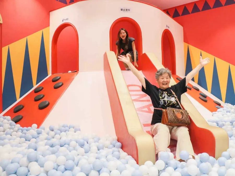 更令人惊喜的是,他们对新兴体验的拥抱远超预期。在一场名为"返老还童体验日"的活动中,环宇城将地点设在三楼的室内儿童乐园meland,组织了15位老人前来体验。