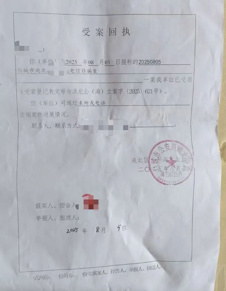 吉林省白城市公安局洮北分局于8月5日出具的《受案回执》显示,该局已受理小南被电信诈骗一案。