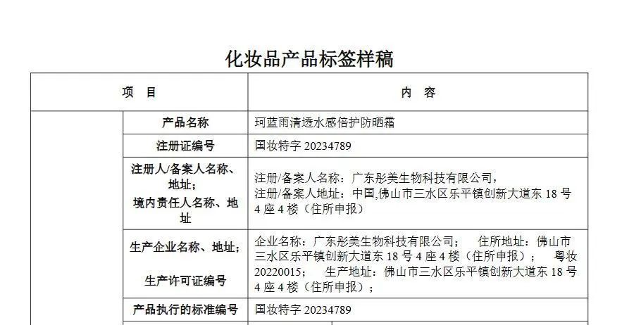 而在国家药监局的官网上,“国妆特字20234789”对应产品的标签样稿上备注,产品商标为“珂蓝雨”(见下图)。