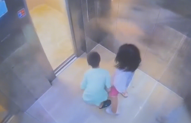 电梯门即将打开的短短几秒内,两个孩子以惊人的速度拉起裤子、整理衣物,动作麻利得像是早已习惯的本能反应。