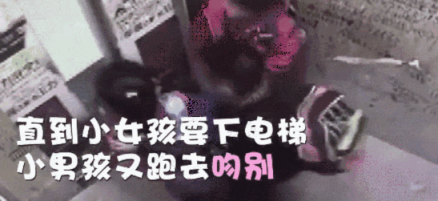其中一名黑衣小男孩,一进电梯就一把将穿玫红衣服的小女孩按在电梯壁上,开始满脸满脖子乱亲。