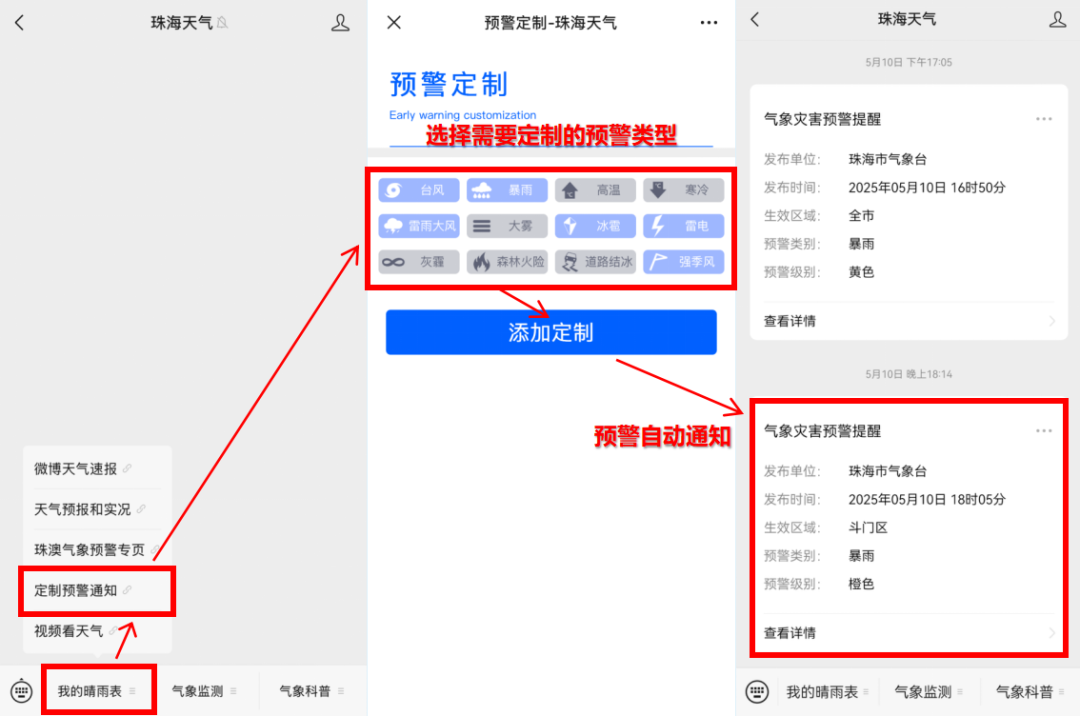 大家可以关注“珠海天气”公众号。在“我的晴雨表”-“定制预警通知”,选择你想定制的预警类型,即可免费收到第一时间的预警通知,方便安排生活计划。