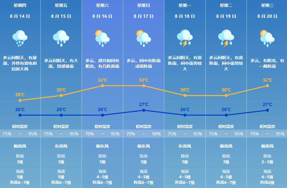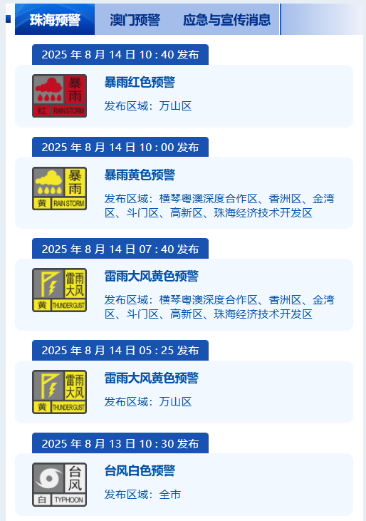 预计万山区外伶仃岛、桂山岛强降雨持续,珠海市气象台于8月14日10时40分将万山区暴雨预警信号升级为红色。