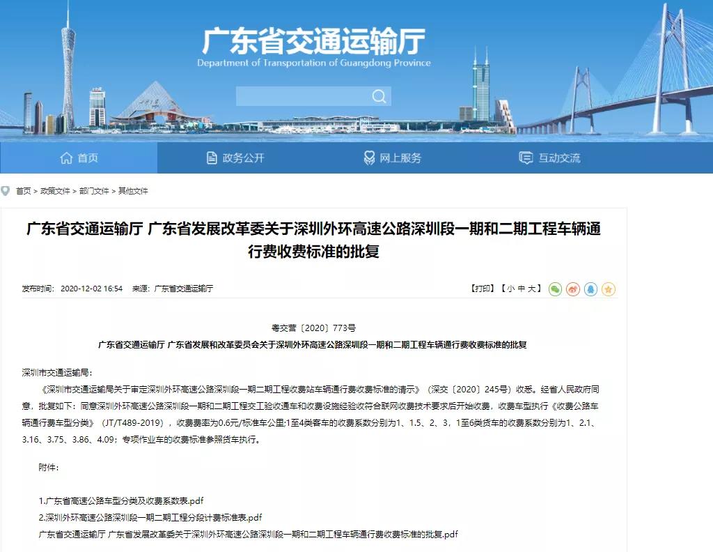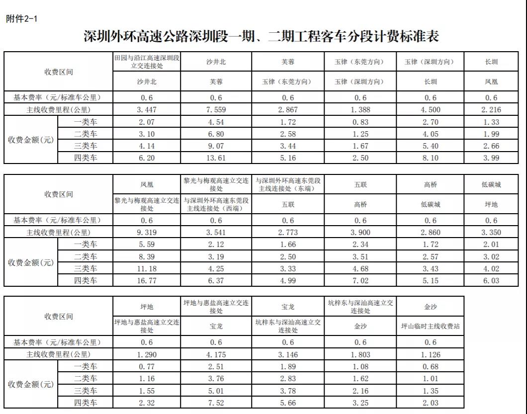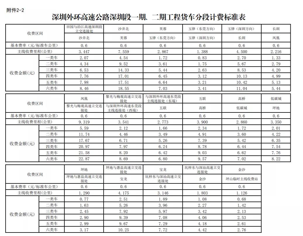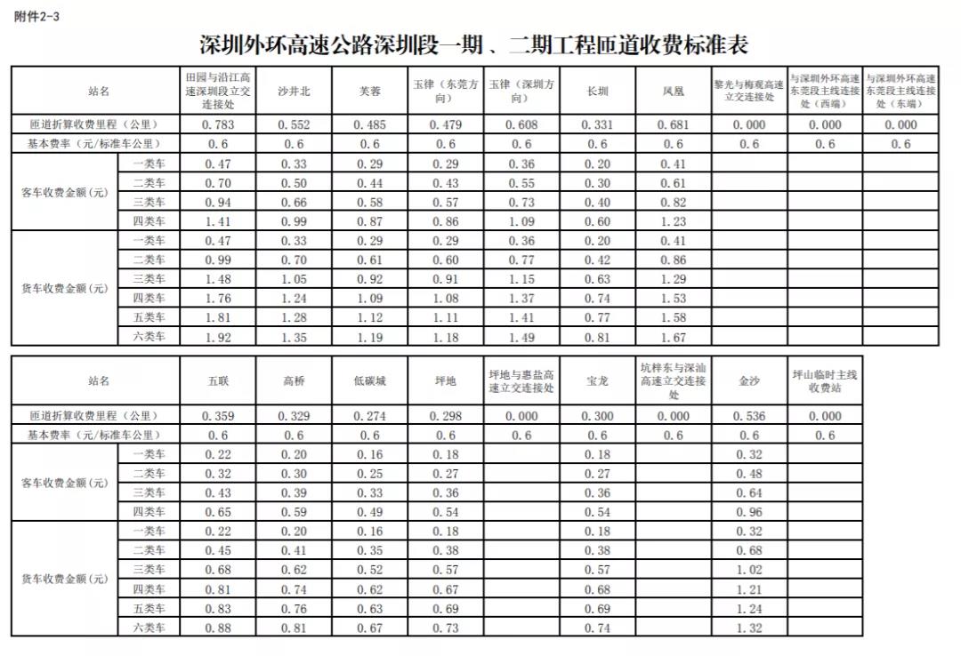途径深圳、东莞的 深圳外环高速 一直以来,都颇受关注 近日,最新消息传来 官方批复了收费标准 日前,广东省交通运输厅、广东省发展和改革委员会联合批复了深圳外环高速公路深圳段一期和二期工程车辆通行费收费标准。 记者从批文中获悉,外环高速深圳段一期、二期工程共设1座主线收费站和11座匝道收费站。 外环高速公路 深圳段一期工程已全线贯通 有望年内通车运营 深圳外环高速公路是由深圳市申请立项、经省发改委批复核准建设的省重点工程,是广东省“十二纵六横十二射两环”高速公路骨架网的一条加密线,也是深圳市“十横十三纵”干线道路网规划的重要一“横”。 项目由深圳段和东莞段组成:西起于广深沿江高速公路,向东经宝安区、光明区、龙华区、东莞市、龙岗区、坪山区、大鹏新区,终点接盐坝高速公路,全长约93公里,其中深圳段76公里,东莞段17公里。 外环高速深圳段项目分三期建设。 ● 一期工程起点接广深沿江高速公路,往东经宝安、光明、坪地等地,连接惠盐高速公路,路线长51公里,设置互通立交12处。 ● 二期工程起点接一期工程东段终点惠盐高速公路,终点接锦绣东路,路线长约9.35公里,设置互通立交3处。 ● 三期工程起点接二期工程终点锦绣东路,终点接盐坝高速,路线长约16公里。全线采用双向6车道高速公路标准建设,设计时速为80到100公里。全线桥梁63座,隧道5座,桥隧比达59%。 至于大家最关心的通车时间 记者也了解到—— 目前,外环高速公路深圳段一期工程已经全线贯通,有望年内通车运营。 外环高速深圳段 一期二期设12座收费站 今年8月份,广东省政府批复同意深圳外环高速公路深圳段一期和二期工程设置收费站问题,同意深圳外环高速公路深圳段一期和二期工程建成通车后,设置坪山临时主线收费站(待深圳外环高速公路深圳段三期工程建成通车后即撤销)和沙井北、芙蓉、玉律、长圳、凤凰、五联、高桥、低碳城、坪地、宝龙、金沙等11个匝道收费站。 此次广东省交通运输厅、广东省发展和改革委员会联合批复车辆通行费收费标准。批文透露,经省人民政府同意,同意深圳外环高速公路深圳段一期和二期工程交工验收通车和收费设施经验收符合联网收费技术要求后开始收费,收费车型执行《收费公路车辆通行费车型分类》 (JT/T489-2019)。 ● 收费费率为0.6元/标准车公里; ● 1至4类客车的收费系数分别为1、1.5、2、3; ● 1至6类货车的收费系数分别为1、2.1、3.16、3.75、3.86、4.09; ● 专项作业车的收费标准参照货车执行。 深圳外环高速公路 深圳段一期二期工程分段计费标准表 (上下滑动可查看) ▽ 项目建成投入使用后 将极大改善深圳北部、 东莞东南部的交通品质 加强东莞、深圳两市交通联系 一起期待早日通车吧~ 来源:深圳大件事 |