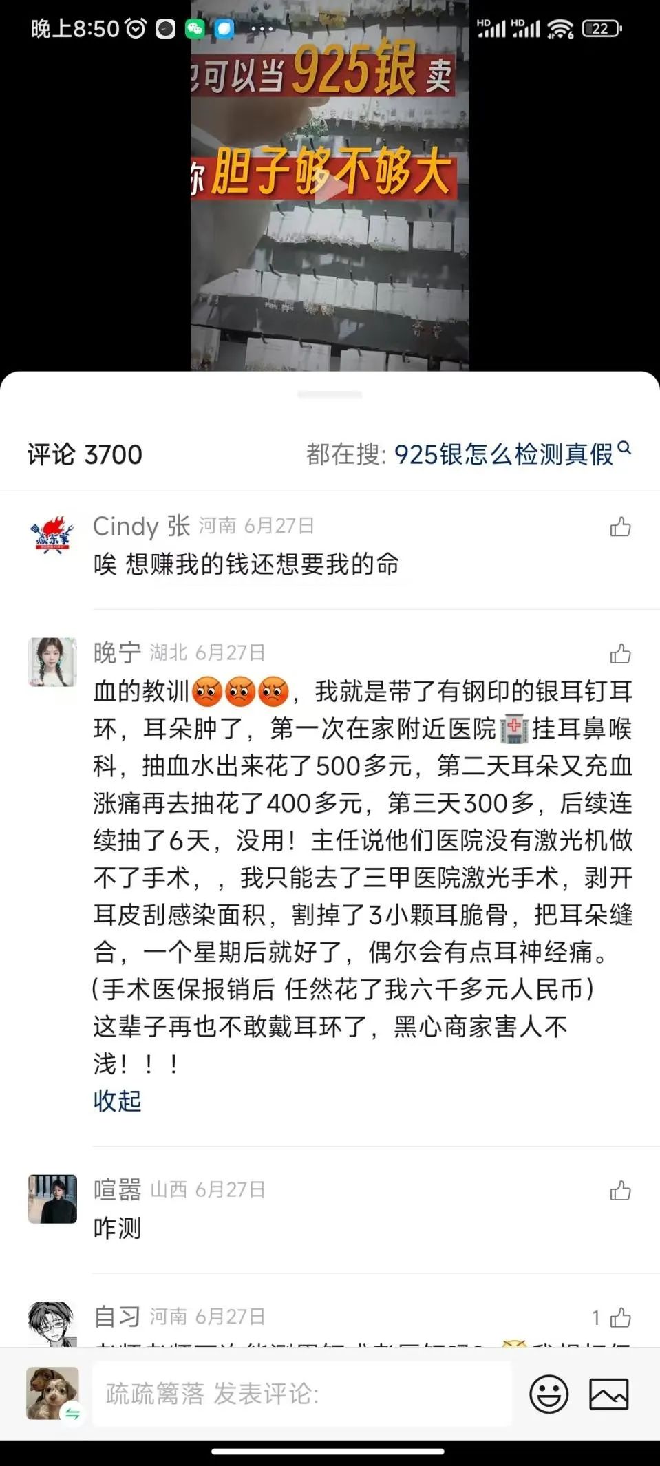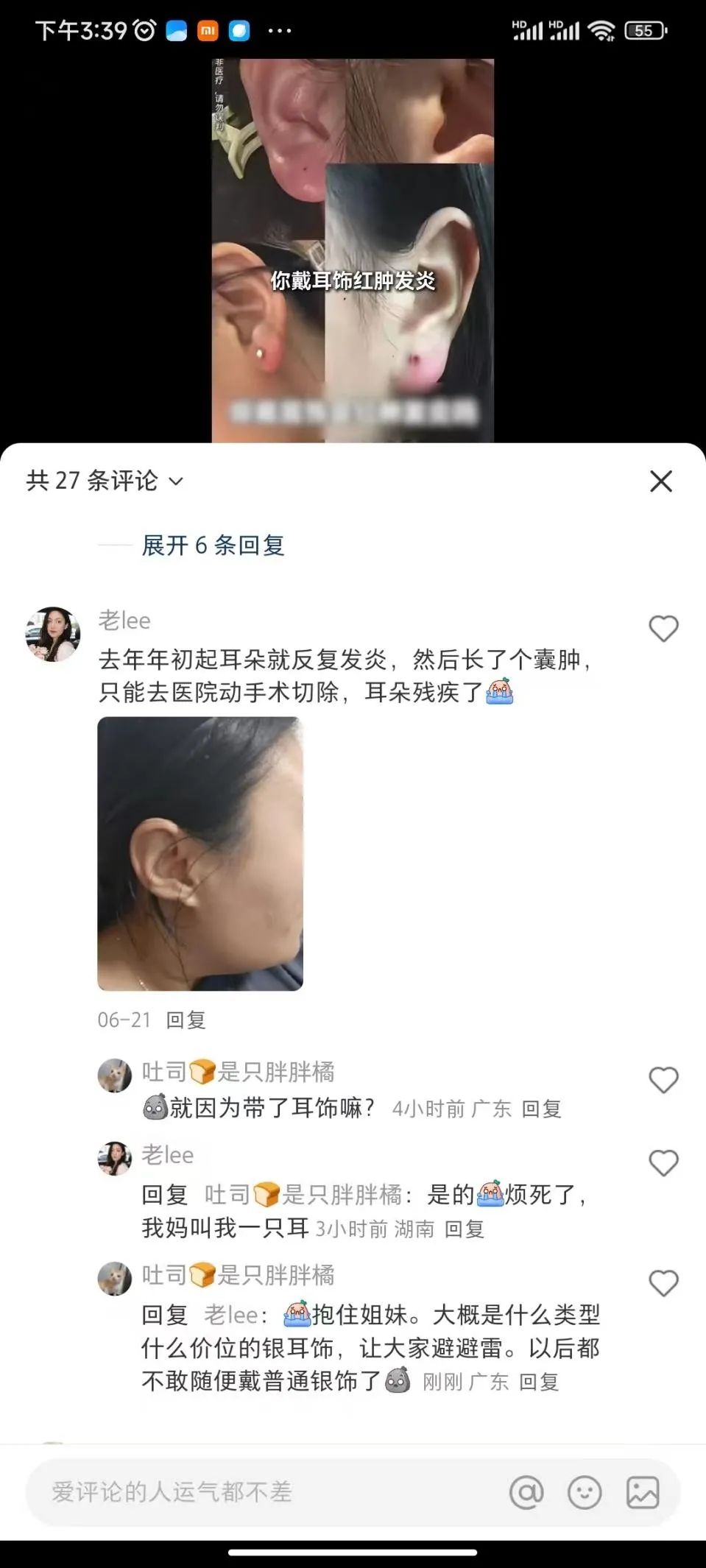 有网友分享自己曾佩戴过不合规银耳饰的经历,结果导致自己耳朵过敏红肿,无奈只好去医院把血水抽出。
