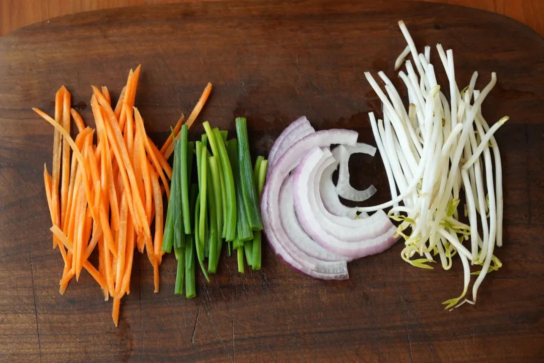 下拉菜谱,好好吃面。 1、我这里是把能用的都用了,家里配菜没那么足的可自行减:1/4根胡萝卜去皮切丝,1/4个洋葱切丝,20g绿豆芽洗净,10g小葱切段。