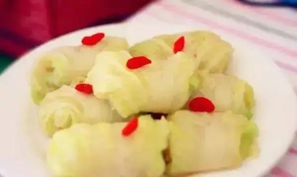 9.清汤白菜卷 原料:白菜500克,北豆腐100克,鸡蛋60克,黄豆粉20克,花生油25克,胡椒粉2克,盐2克。 做法: 1.用豆腐、鸡蛋、胡椒粉、盐、豆粉调成茸。 2.白菜洗净去硬梗,用滚水烫一下,沥干水分。 3.将白菜摊开,上放调好的豆粉茸卷裹成卷,上笼蒸约5至10分钟。 4.取出切成1-1.2厘米长的短段。 5.加排入蒸碗内,再入笼蒸熟,翻扣入汤碗中,加汤汁即成。