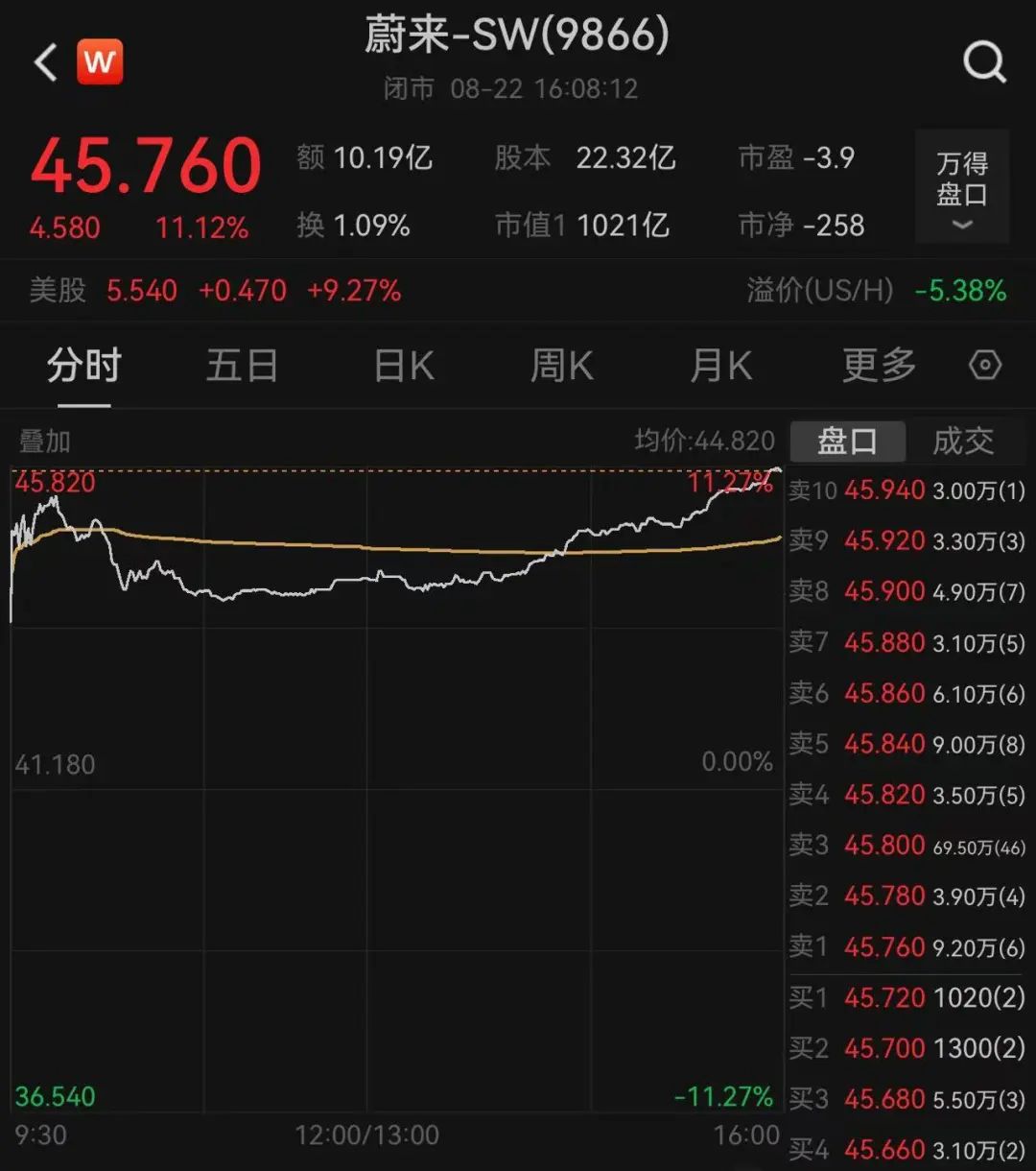 二级市场上,美股蔚来上涨9.27%。截至8月22日收盘,港股蔚来-SW(9866)股价上涨11.12%,报45.76港元。
