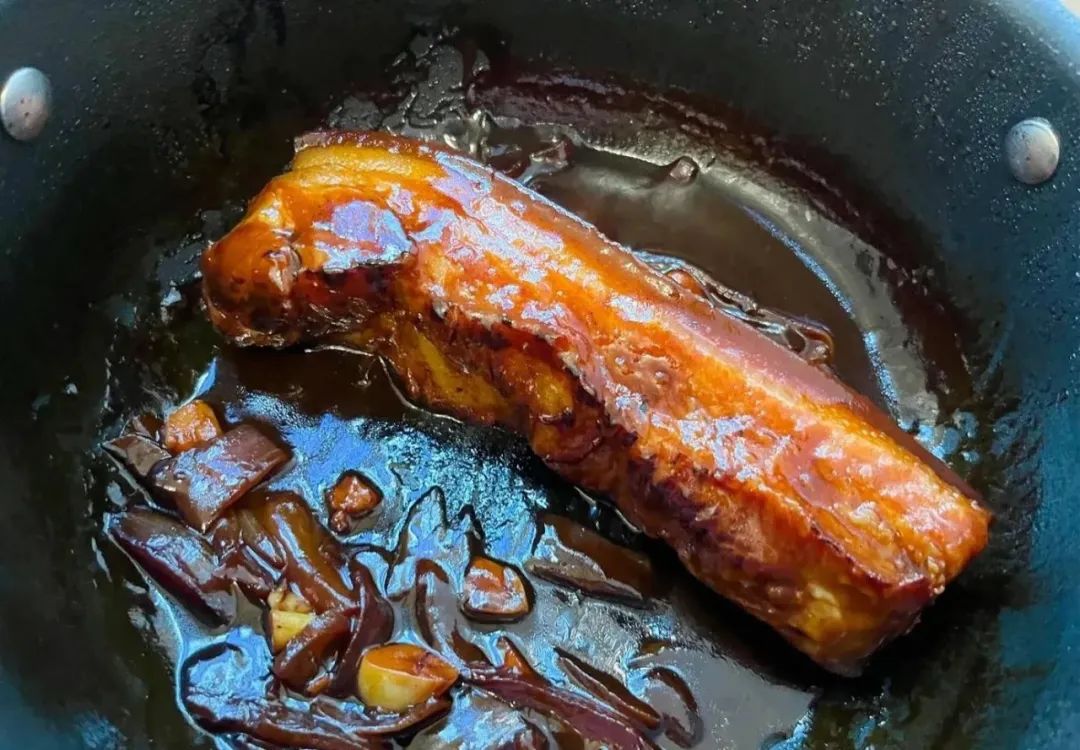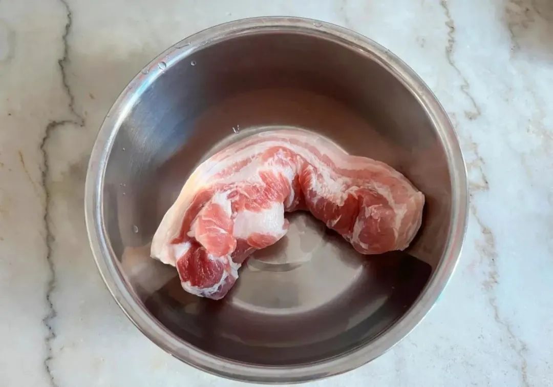 起锅烧油放入腌制好的五花肉(挑去葱蒜)