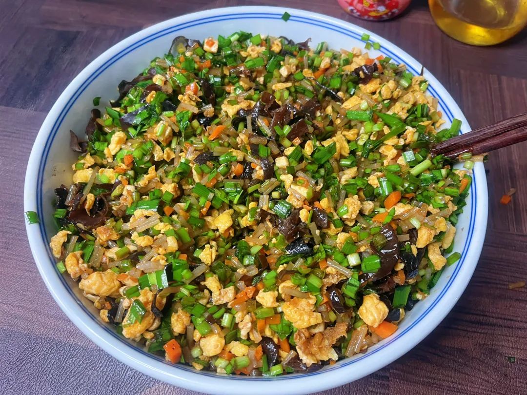 5,把粉条碎倒入切好的韭菜中,再加入放凉的豆腐胡萝卜丁、木耳丝、鸡蛋碎,调味加盐、蚝油、花椒粉,搅拌均匀就可以了。