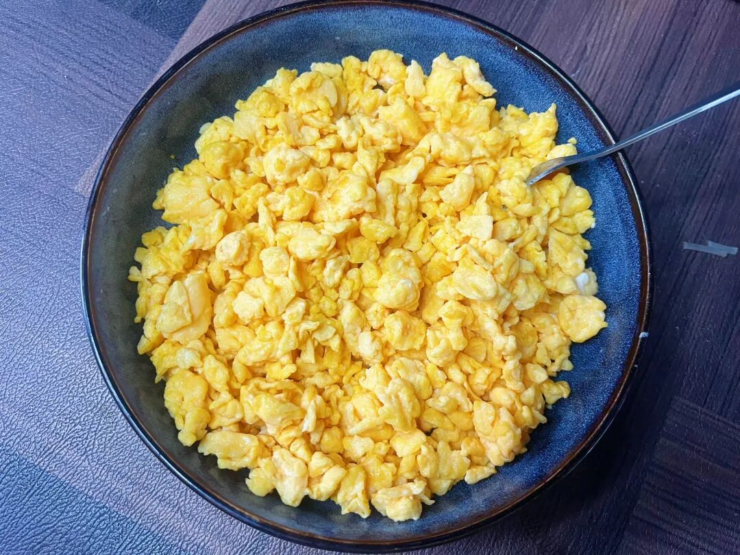 2,我用了6个鸡蛋,打入碗中加少许盐增加底味,用筷子充分搅散,热锅凉油倒入蛋液,快速划成小块,炒熟后盛出来放凉备用。