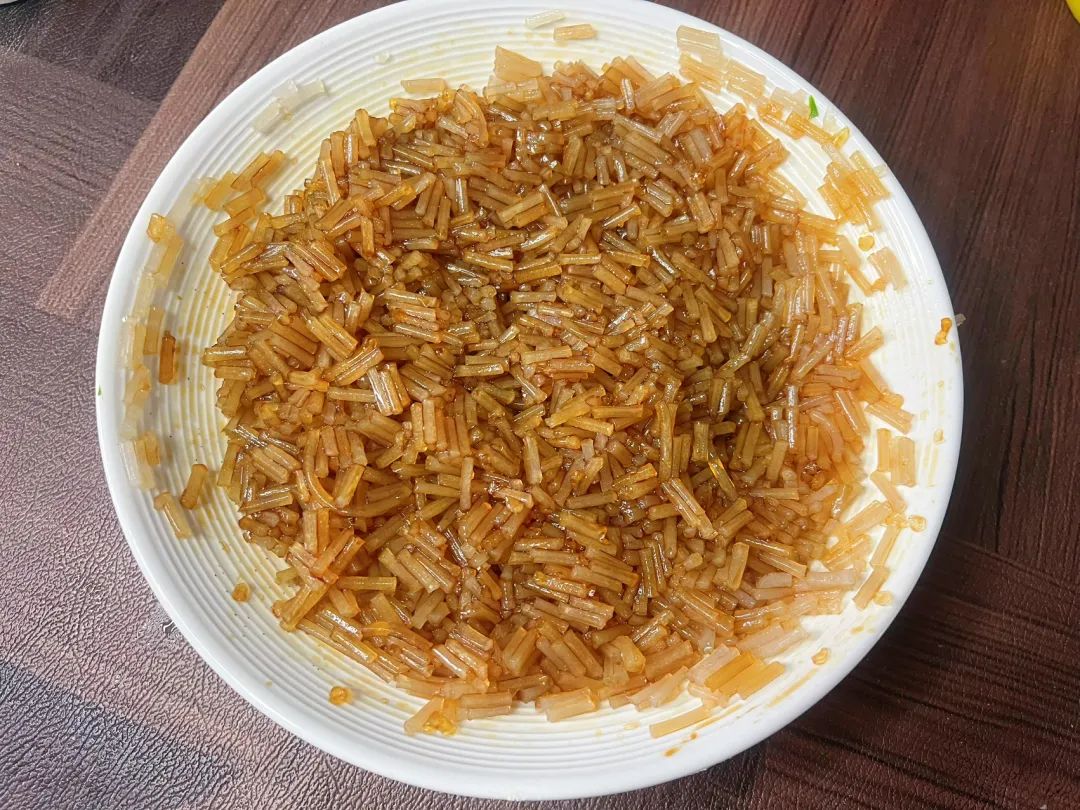4,半碗粉条碎,提前10分钟用热水泡上,泡软捞出沥干水分,加老抽和香油搅拌上色。