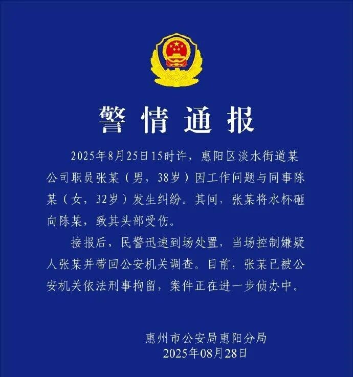 8月25日15时许,惠阳区淡水街道某公司职员张某(男,38岁)因工作问题与同事陈某(女,32岁)发生纠纷。其间,张某将水杯砸向陈某,致其头部受伤。