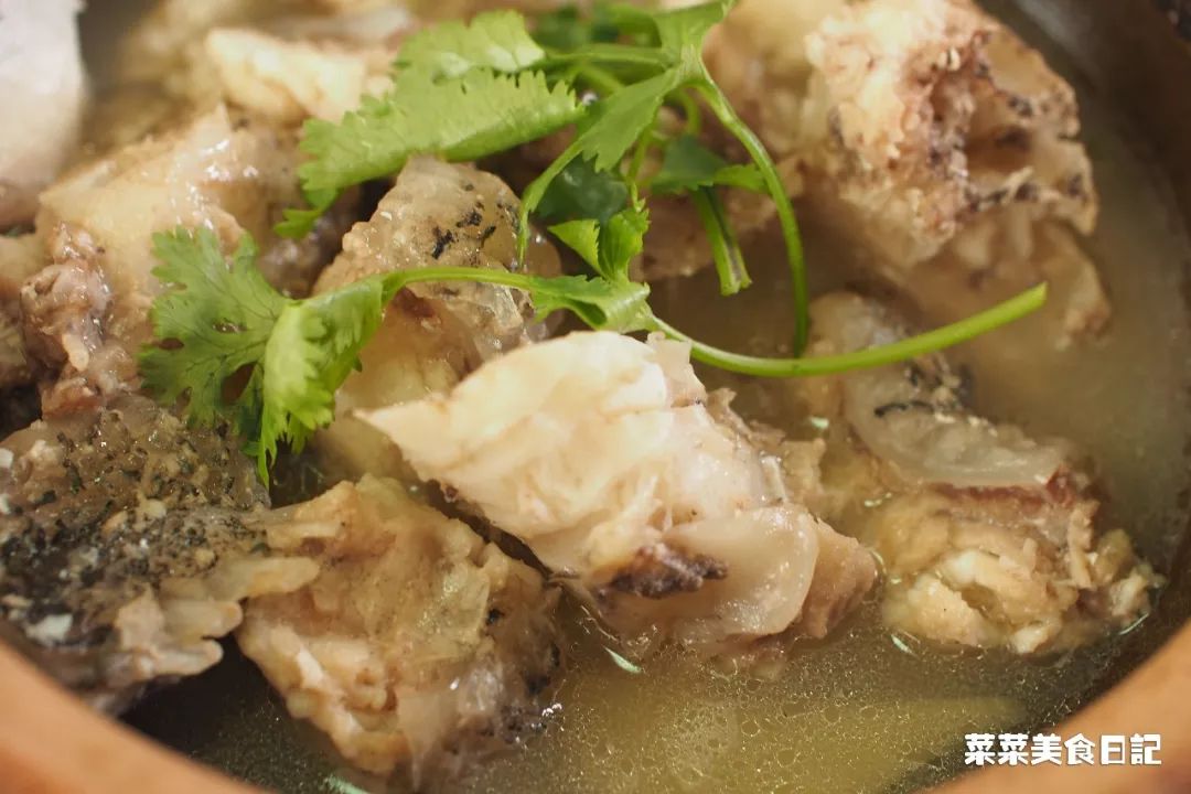 点蘸一点蒸鱼豉油,鲜嫩,微甜,几乎无刺,吃起来超过瘾。鱼皮口感糯糯弹弹,缠缠绵绵的胶质感差一点要把嘴唇黏住。和雪菜山椒一起吃就更刺激了,雪菜发出爽脆的簌簌声,被牙齿碾压出鲜灵汁水。山椒带来一点辣味和发酵过的酸,整体更有辨识度,辣味很是撩人。片出来的鱼骨也浪费不得,煎香后冲入热水,再撒一把蛤蜊和青菜。