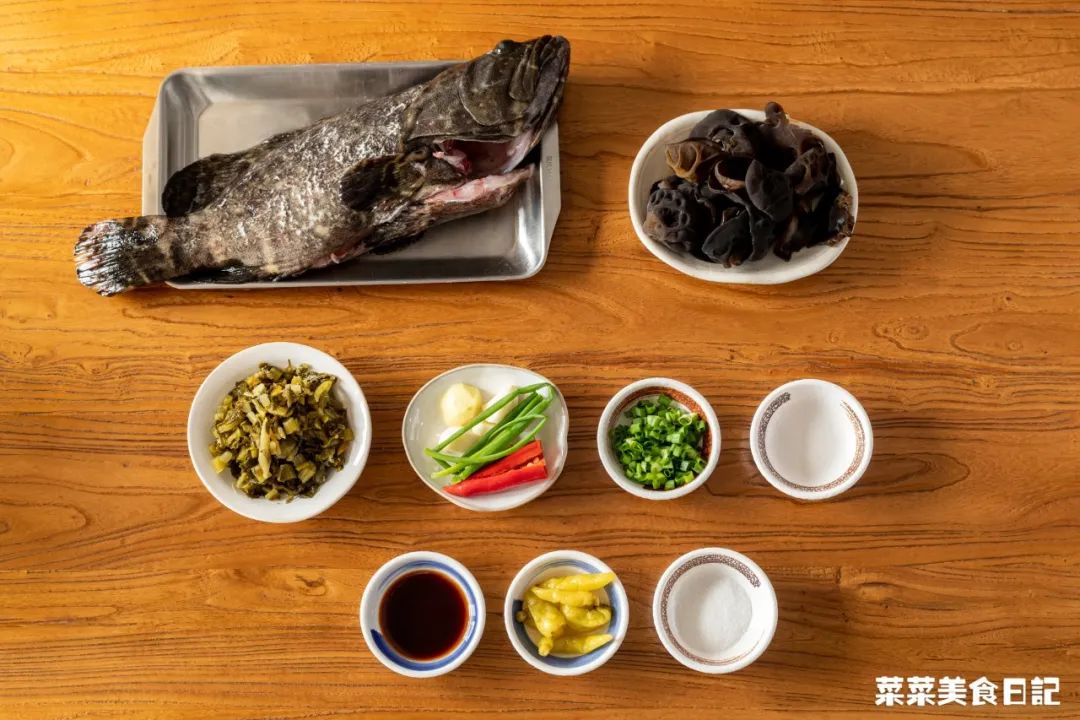 [ 食材 ] 石斑鱼1条 木耳100g 雪菜60g 泡野山椒6根 蒜瓣3瓣 姜1小块 白糖1小勺 蒸鱼豉油2小勺 红椒、葱绿适量