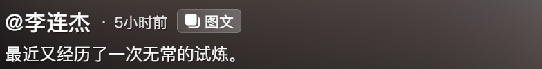8月17日,李连杰的认证社交媒体账号更新图文,文字写道“最近又经历了一次无常的试炼。”两张配图中,一张是李连杰躺在病床上,另一张图片是手术室的照片。因近年鲜少活跃于荧幕前,关于李连杰的谣言不断出现。