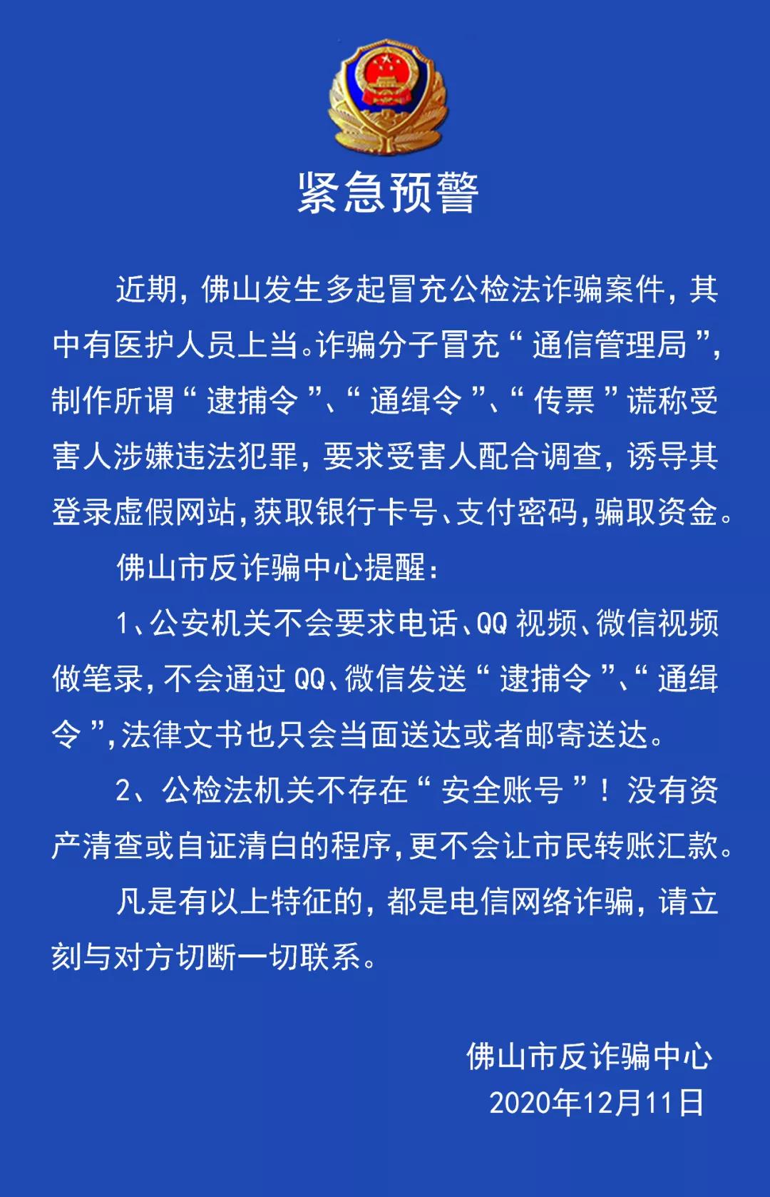 近期,佛山发生多起冒充公检法诈骗案件,其中有医护人员上当,