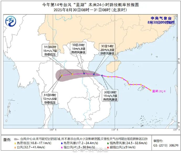 据中央气象台消息,今晨8时第14号台风“蓝湖”生成,9时其中心位于距离越南广治省洞海市东偏北方向约125公里的海面上,强度热带风暴级(8级,18米/秒)。预计“蓝湖”将以每小时25-30公里的速度向偏西方向移动,强度变化不大。