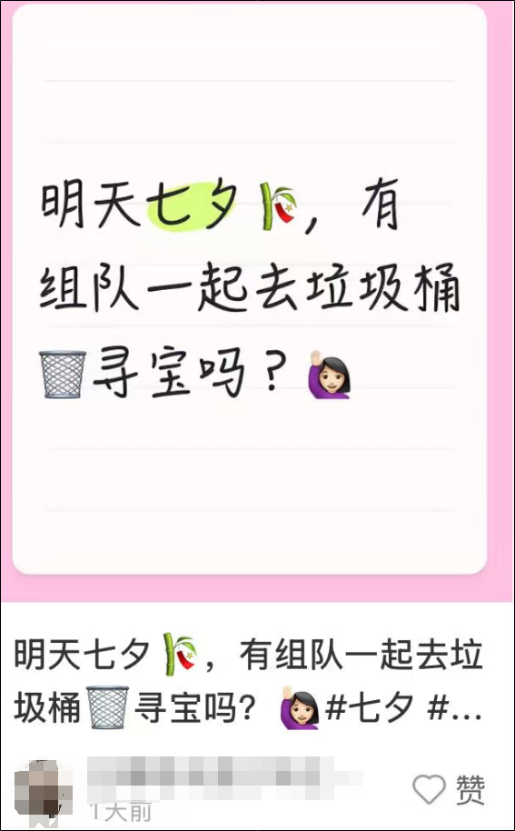 社交平台上有网友制作并分享了不同城市的“捡垃圾攻略”,甚至约定组团在七夕夜间前往商场、高档小区附近的垃圾桶周边“蹲点”,希望捡到被丢弃的鲜花、蛋糕、饰品甚至贵重礼物。