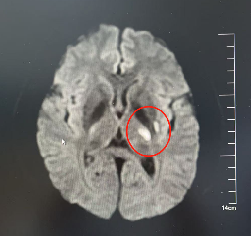 CT检查考虑是动脉粥样硬化导致的急性脑梗死(俗称:中风)。