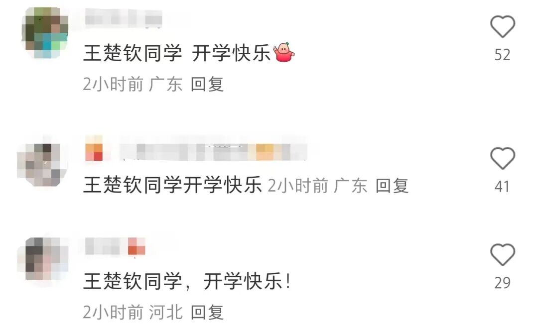 评论区有多位球迷留言:王楚钦同学,开学快乐!