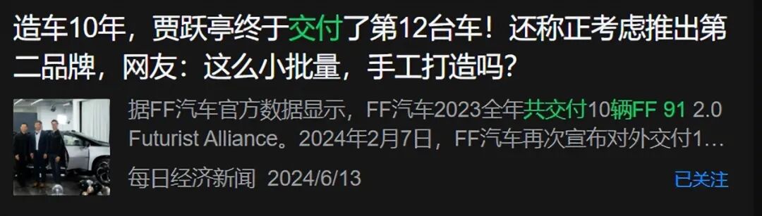 即使在2021年的时候,贾跃亭获得了1亿美元的融资,但因为造车太过于烧钱,FF91不仅烧光了融资,还仅仅只交付了10多辆车。