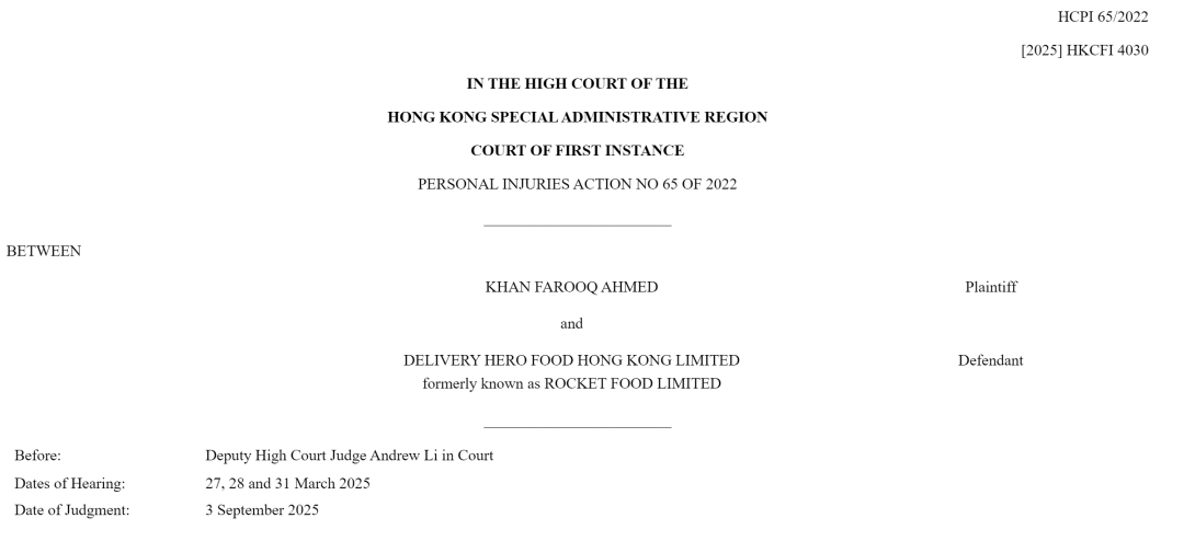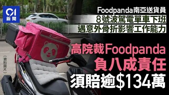 9月3日,香港法院公布了一桩判案。5年前,48岁南亚裔摩托车骑手、Foodpanda(以下统称熊猫饭)外卖员在8号风球生效时工作,遭遇交通事故,导致背部、右膝及右手手指受伤,需休病假785天。高等法院法官李树旭颁布书面判词指出,熊猫饭辩称外卖员可在繁忙时段拒绝接单的说法违背常理,也不符合雇佣合约条款,裁定熊猫饭须承担八成责任,并下令其向该外卖员赔偿134.8万港元。 来看看详细案情。 据判词透露,原告名叫KHAN FAROOQ AHMED,是一名南亚裔外卖员,案发时48岁,平常都是驾驶电单车进行工作。而被告则是外卖平台熊猫饭母公司DELIVERY HERO FOOD HONG KONG LIMITED。