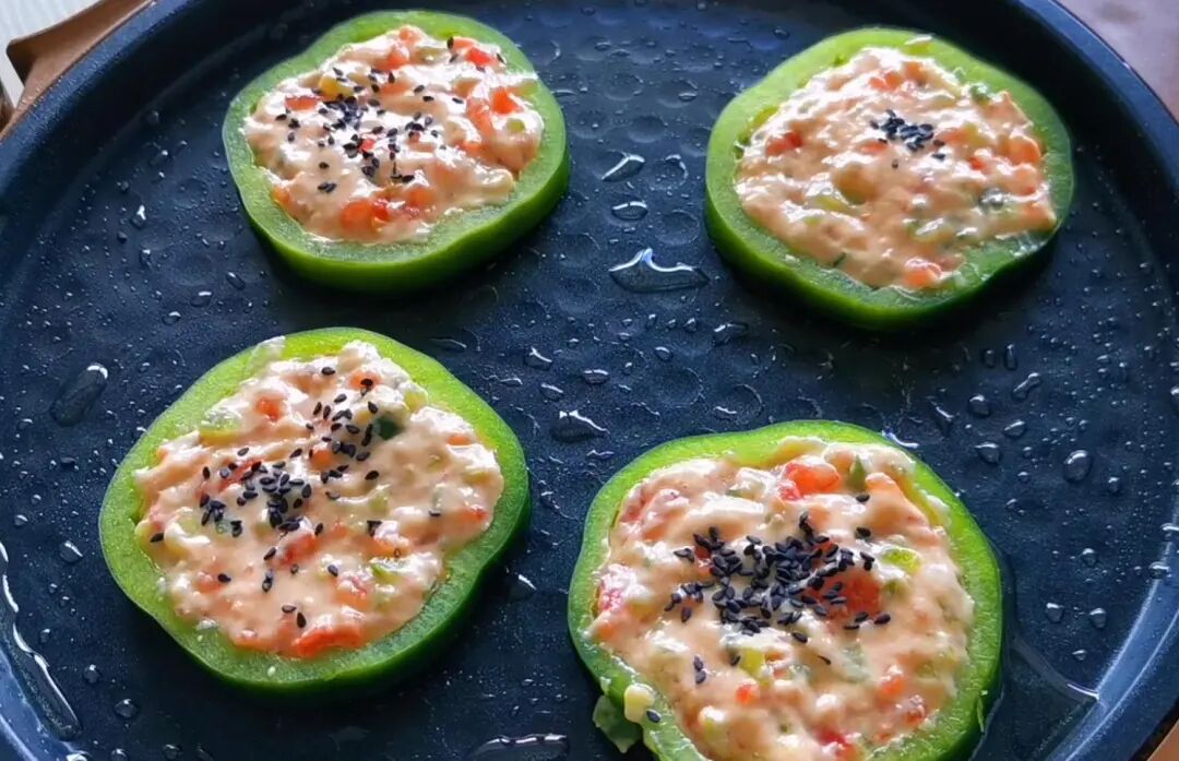 今天给大家分享一个蔬菜早餐饼的做法,多种蔬菜搭配,做法简单,营养丰富,简单易学,一出锅香嫩又美味,咬一口外焦里软,还有淡淡的西红柿味和芝麻香,一出锅孩子自己就吃了六个。! 做法: 1,准备食材:青椒,西红柿,鸡蛋,面粉,食盐,胡椒粉,食用油。 2,青椒清洗干净去掉青椒蒂,切成小圈,再用勺子挖掉青椒里面的瓤,放入盘中备用。 3,西红柿清洗干净打上十字花刀,倒入刚刚离锅的开水烫5分钟。 4,烫好的西红柿轻松去皮,切成小块再剁碎一点。或者用勺子在西红柿表面轻轻一刮也可以轻松去皮。 5,再把另外一个青椒去蒂去籽剁成小碎丁装入碗中,放入切碎的西红柿丁,打入两个鸡蛋,再加入一点点食盐,胡椒粉搅拌混合均匀。 6,再分次加入面粉,随加随搅拌,最后搅拌成黏稠的蔬菜面糊即可。 7,电饼铛刷上一点食用油放入青椒圈,再倒入搅拌好的蔬菜面糊,整理平整撒上一点黑芝麻增香。 8,煎大约2分钟左右,煎至定型一面金黄后翻面,再煎上2分钟左右,煎至两面金黄即可出锅。 这样做出来的早餐蔬菜饼,香嫩美味,营养又解馋,多种蔬菜和鸡蛋搭配香味十足,小孩子特别爱吃,三天两头点名要吃,再也不用担心孩子不吃早餐,不爱吃菜了。