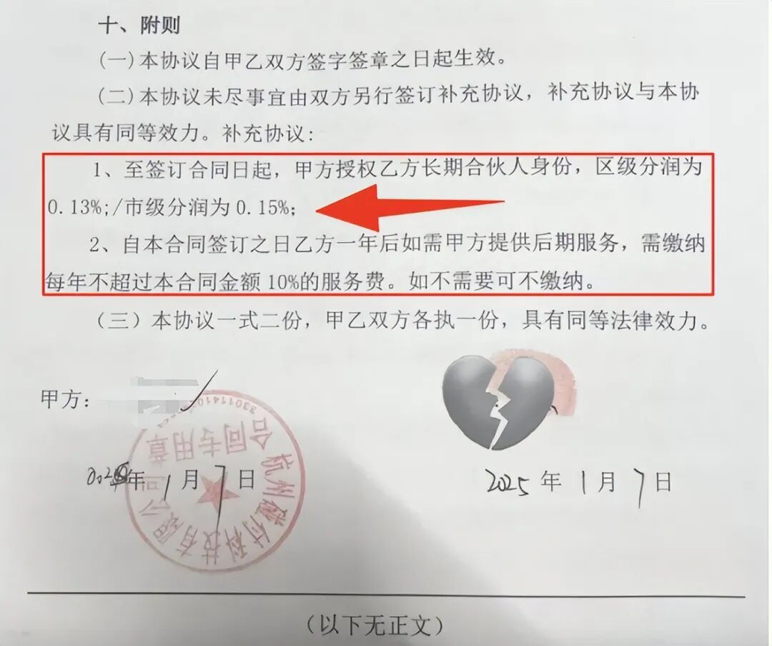 合同中指明,成为长期合伙人身份后,区级可获得0.13%分润,市级可获得0.15%。