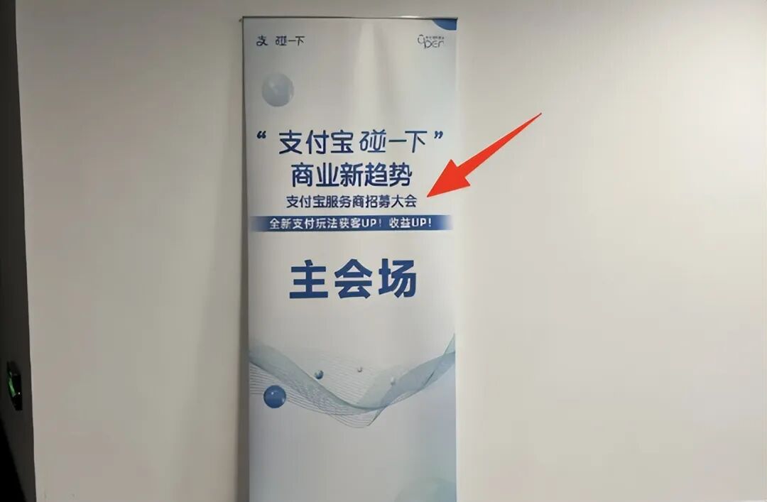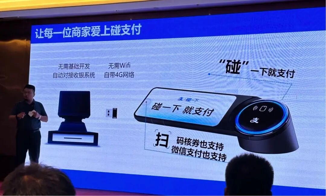 会场布置得很隆重,工作人员统一穿着印有“支付宝”标志的制服,屏幕上循环播放着商户使用“碰一碰”支付的热闹场景。