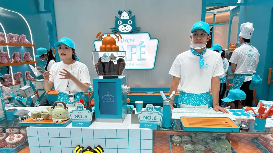 Jellycat的与众不同之处在于仪式感,比如上述这家Jellycat咖啡店,笔者在现场看到,其实店内都是毛绒玩具,但因为是咖啡店主题,因此店内所有的玩具都是食物造型,包括各类糕点、咖啡与茶饮等,甚至还做了“烤箱”等设备,将部分糕点造型的玩具放置在“烤箱”内,营造“现烤食物”的氛围感。最绝的是买单环节,当顾客买了咖啡店限定款茶壶、茶杯、蛋糕、拿铁等造型的毛绒玩具后,店员会在打造成咖啡店食品结账柜台的打包处开始表演,把毛绒蛋糕玩具“点上蜡烛”,请顾客许愿,然后装入糕点盒,再拿出茶具玩具,给顾客“泡茶”,给拿铁造型玩具现场“打奶油”……这一系列表演其实就是完成一套仪式感,让顾客有“过家家”的感觉。