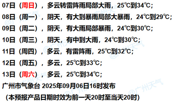 广州市气象台预计,9月7日起广州雷雨趋于明显。9月8日—9日受热带气旋云系影响,广州有大到暴雨局部大暴雨降水过程,并伴有8~10级短时大风、短时强降水、强雷电、局地龙卷等强对流天气。