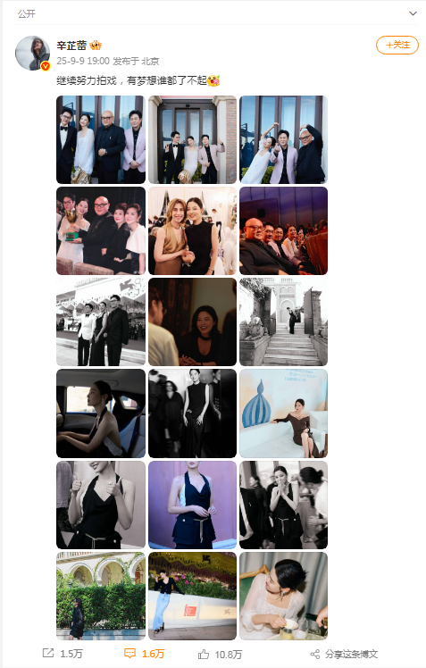9月9日晚,辛芷蕾在微博分享了自己此次威尼斯国际电影节之旅的18张照片,并配文:“继续努力拍戏,有梦想谁都了不起”。