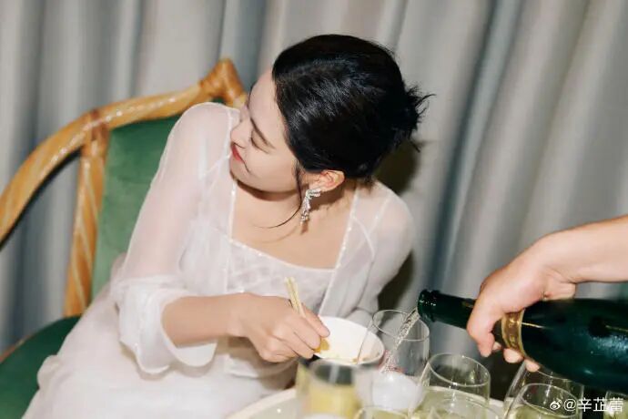 其中一张照片上,辛芷蕾身着领奖时穿的白色礼服,正笑着用一次性筷子吃泡面,旁边有人正在给她倒香槟庆祝。网友看到之后忍不住留言调侃:“香槟配泡面第一人”“在威尼斯吃泡面,果然是中国演员中国胃”。