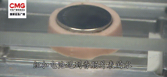 为直观模拟纽扣电池的破坏性,实验人员将一枚纽扣电池放在香肠上,电池遇到香肠里的水分,发生电解并产生碱性液体,很快香肠表面就被严重腐蚀。
