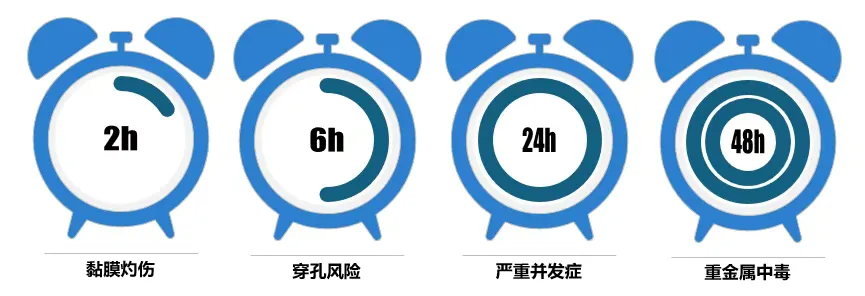 通常来说,灼伤在电池吞入后15-30分钟内就开始发生,超过6小时就可能导致食道严重烧伤、穿孔,甚至永久性损伤,或导致终生无法正常进食。