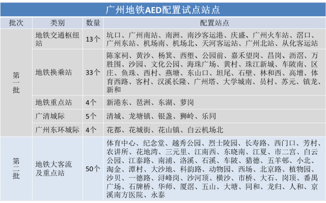 : 在地铁里身体状况突发意外怎么办?今天广州地铁首批AED(自动体外除颤器)上线啦!根据广州地铁AED配置方案,首批试点的59台AED已于12月18日下午2点完成安装使用,其中,50台设置在50座地铁车站,另外9台设置在广清 ...