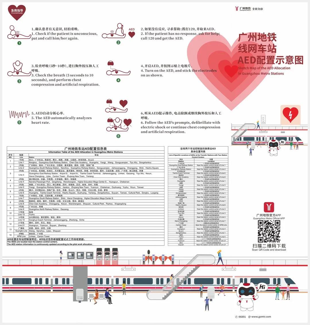 为方便乘客掌握并了解AED的配置情况,广州地铁已在官方APP上标注AED配置车站,相关告示也已在车站区域和地铁电视上刊发。