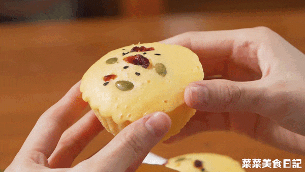 [ 食材 ] 鸡蛋3颗 白糖60g 低筋面粉100g 泡打粉4g 奶粉15g 吉士粉15g 玉米油20g 牛奶(可选)15ml 果干/芝麻适量 1大勺=1 table spoon=15ml