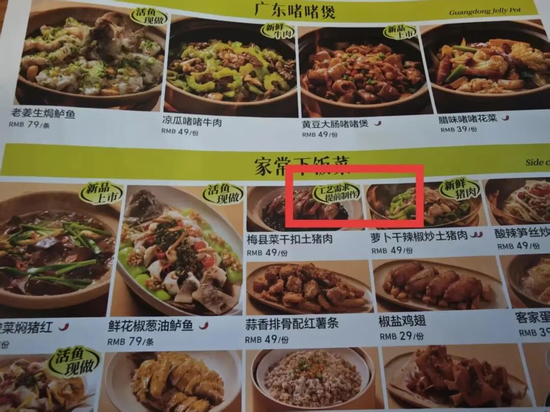 在客语菜单上,梅县菜干扣土猪肉这道菜上方注明“工艺需求提前制作”