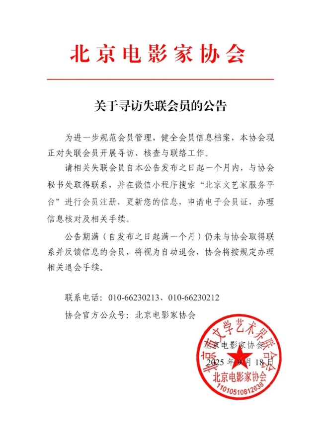 9月19日,北京电影家协会在官方微信公众号发布“致歉声明”:协会于9月18日发布会员寻访公告,目的是为完善会员信息、加强会员联系服务,因工作方法不当、表述不严谨,引发了网友的关注,给部分会员带来困扰,对此深表歉意。