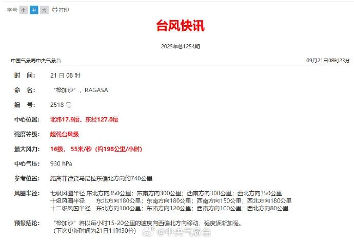 根据“中央气象台”微博消息, 西北太平洋今年的“风王”诞生了! 今晨8时, “桦加沙”中心附近最大风力 达到55米/秒,16级。