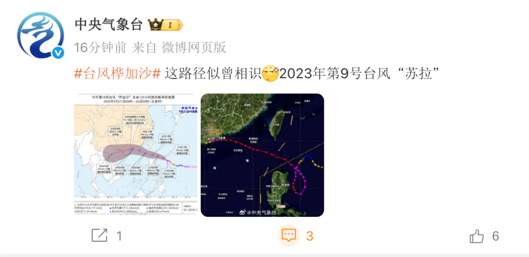 “中央气象台”微博表示 台风“桦加沙”这路径似曾相识 2023年第9号台风“苏拉”