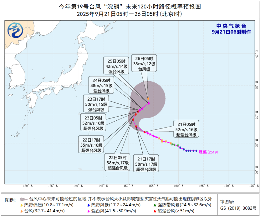 台风“浣熊”已于今天(21日)早晨 加强为超强台风级, 5时其中心位于 距离日本东京东偏南方向 约1600公里的西北太平洋洋面上, 就是北纬27.0度、东经153.2度, 中心附近最大风力有16级(52米/秒), 中心最低气压为935百帕, 七级风圈半径180-250公里, 十级风圈半径140公里, 十二级风圈半径90-100公里。