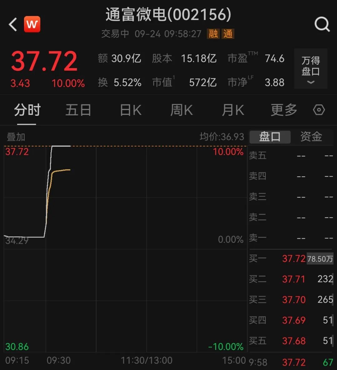 通富微电涨停,江波龙、赛腾股份、德明利、江丰电子跟涨。