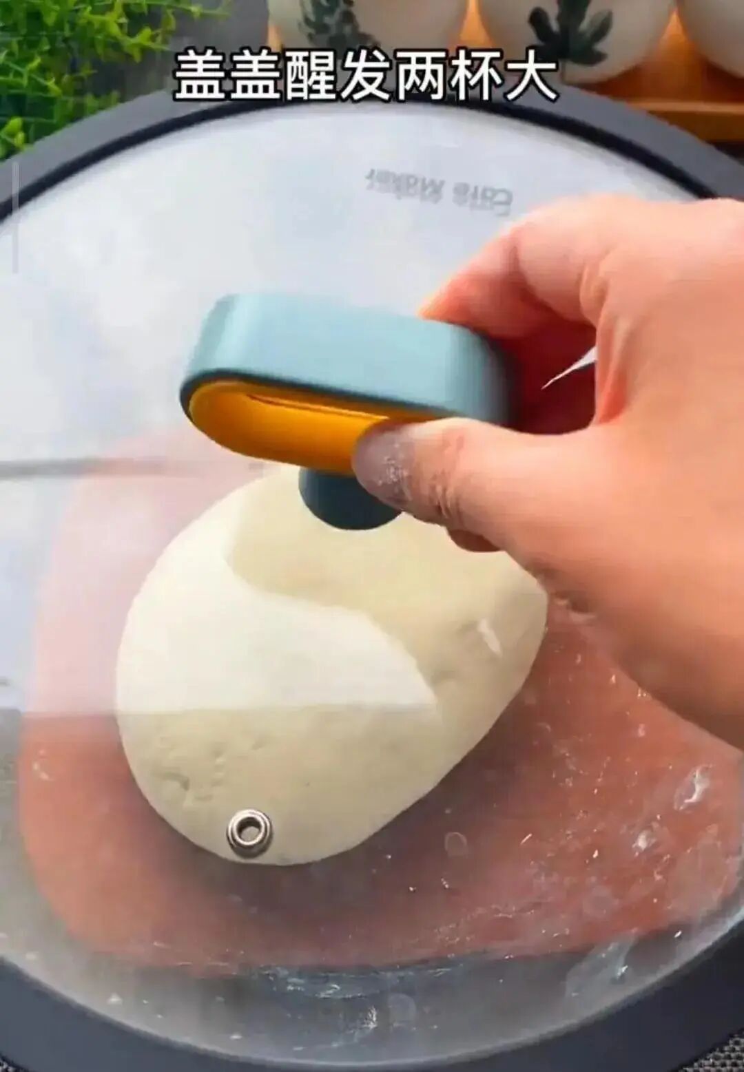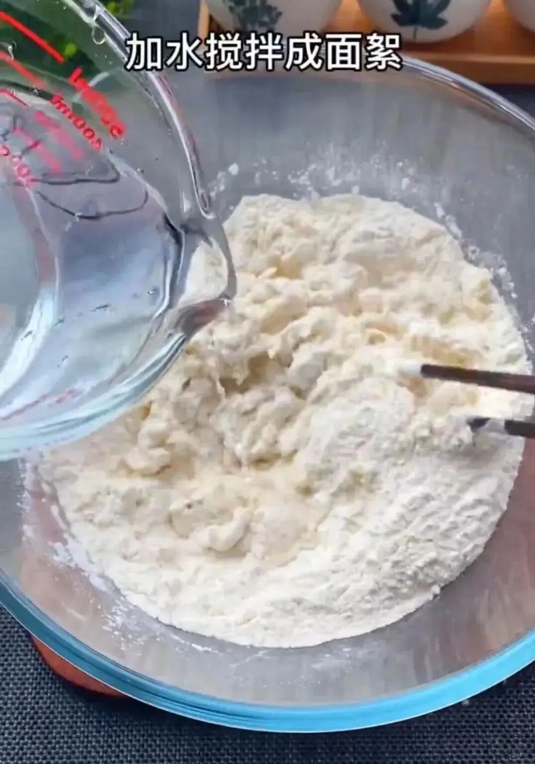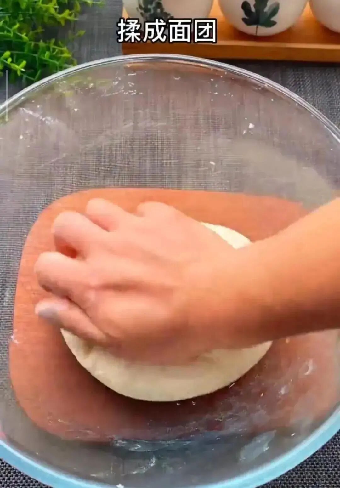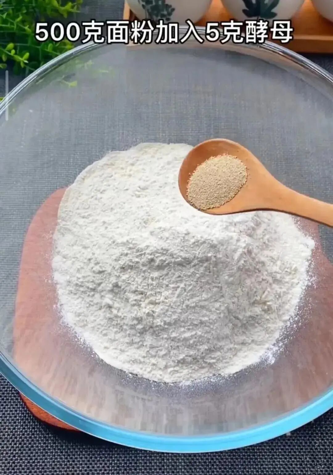5、接着开始做好吃的花卷,盆中放入500克面粉加入5克酵母; 6、加水搅拌成面絮,揉成面团,盖上盖子醒发成两倍大;