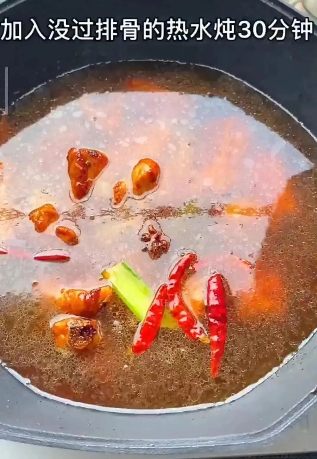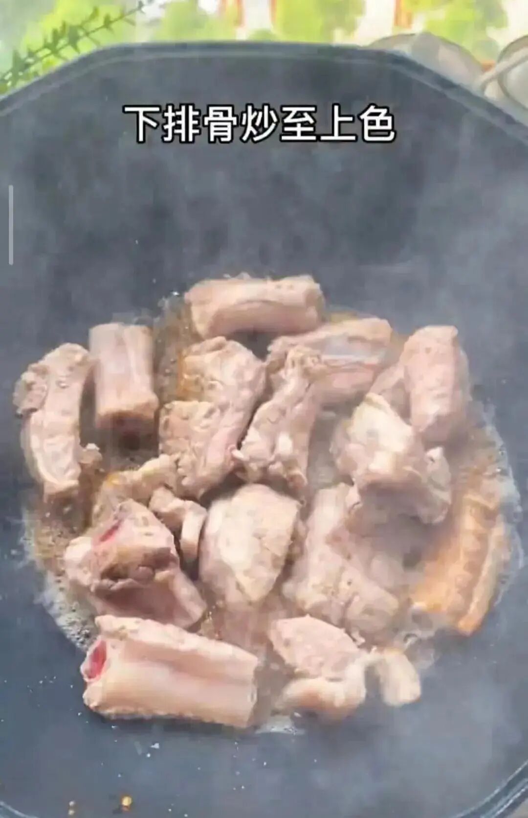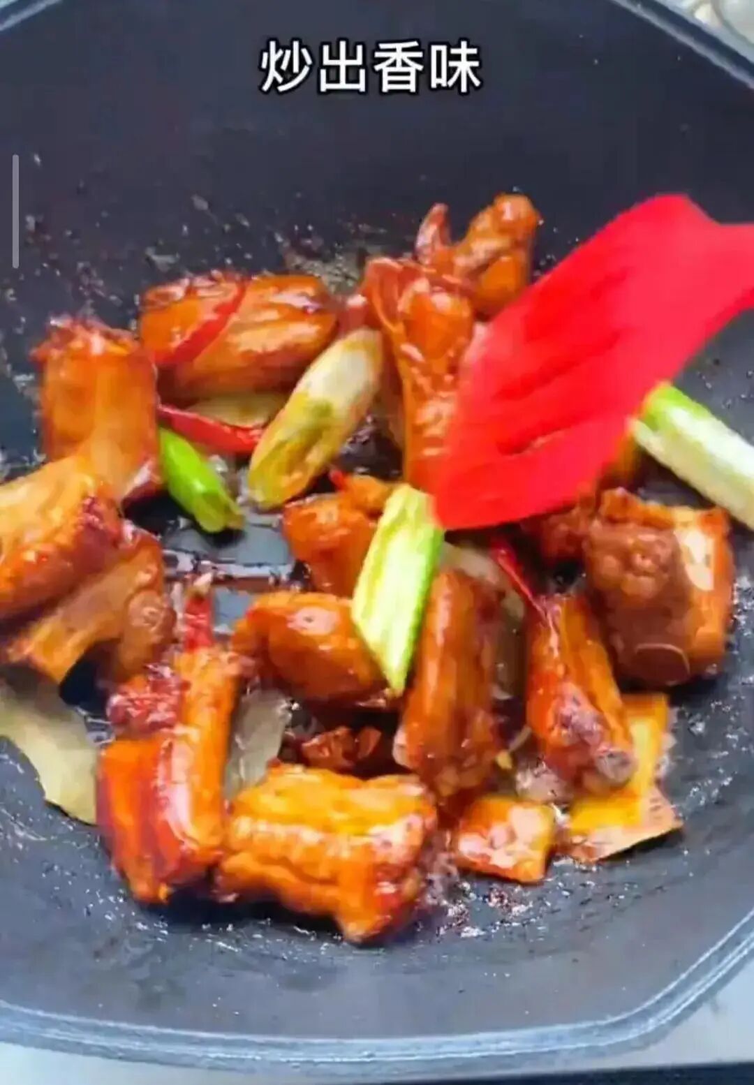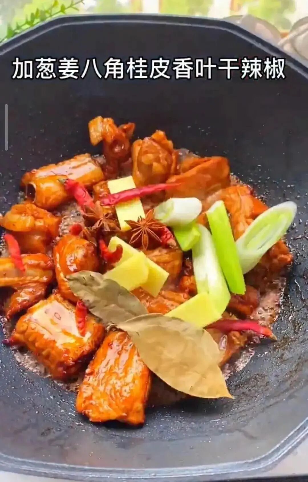 2、将洗干净的排骨倒入,炒至上色; 3、里面加入葱姜、八角、桂皮、香味、干辣椒炒出香味;